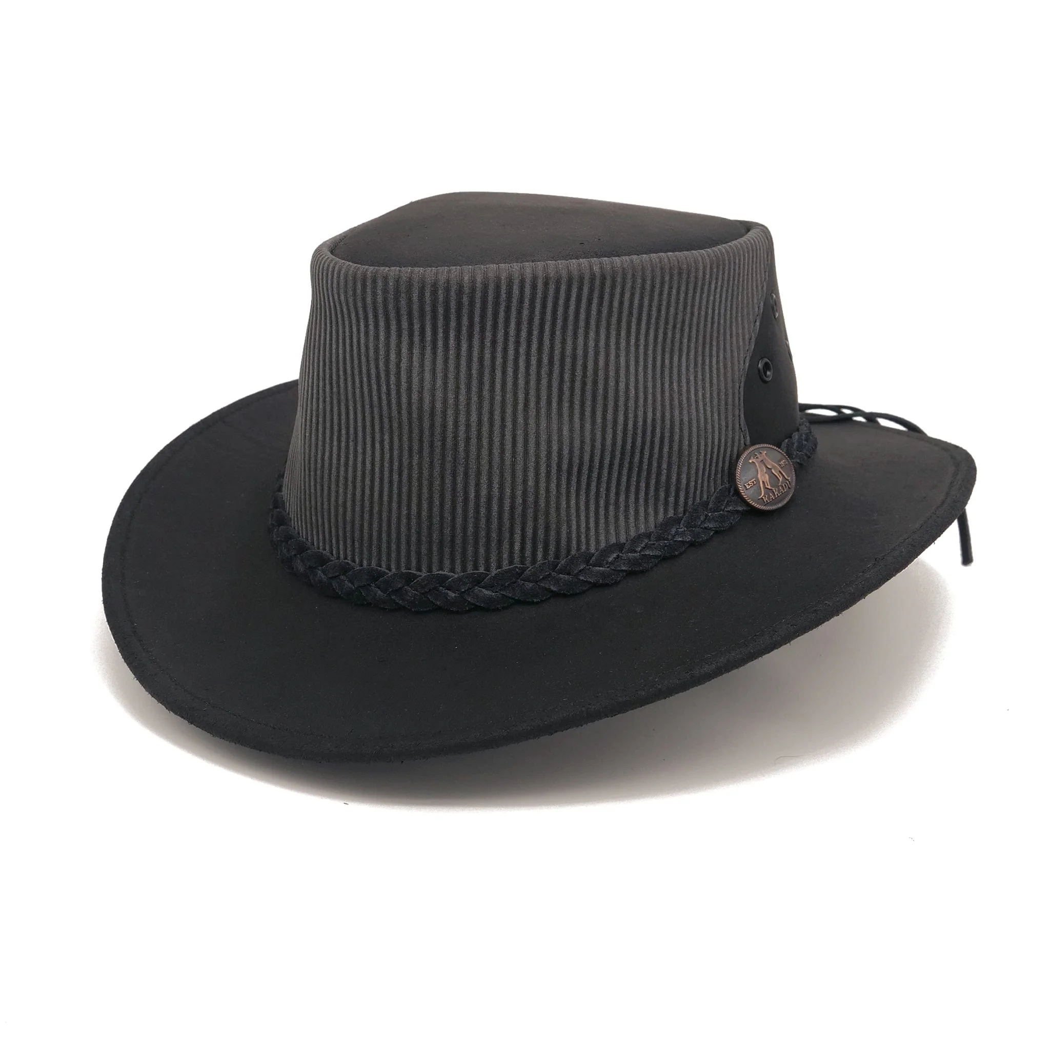 •ÈÀA recent addition to the Kakadu collection, the Newtowner Leather Hat sports a narrow, curved brim and is constructed from premium black cowhide with a stiped embossed front panel. It features an extra long hand-braided suede hatband that can be cut shorter to preference as well as ventilation eyelets, chinstrap facility and a rating of UPF 50+. A versatile Australian style bush hat suitable for city or outback use.