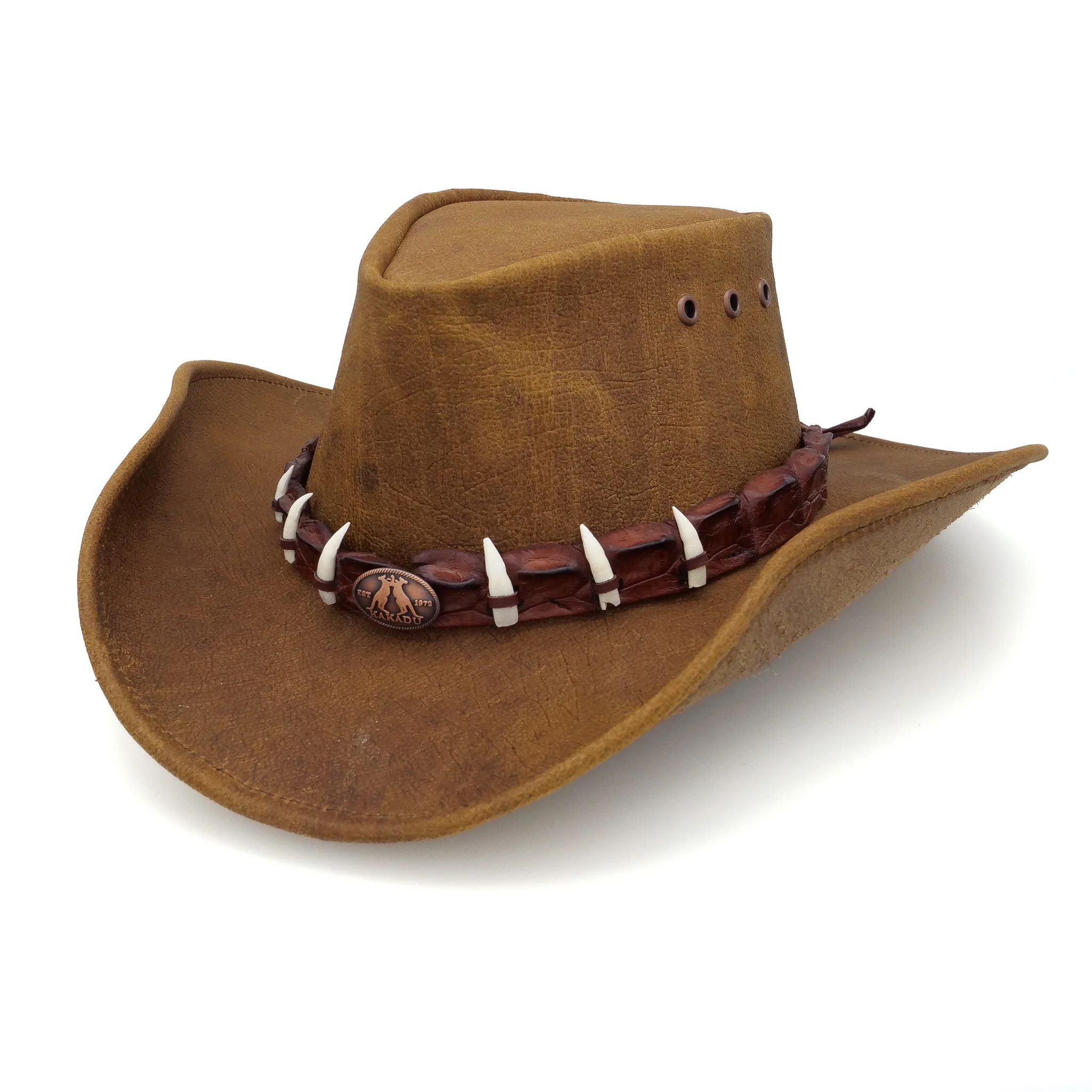 Now, let’s yarn about that hatband — genuine Australian crocodile leather, complete with teeth and a Kakadu badge to boot. It’s not just a statement; it’s a story around your crown, a bit of the wild that whispers tales of the bush. And with a shapeable brim and crown, you can tip your hat to the sun, the rain, or the cheeky cockatoo eyeing your lunch.